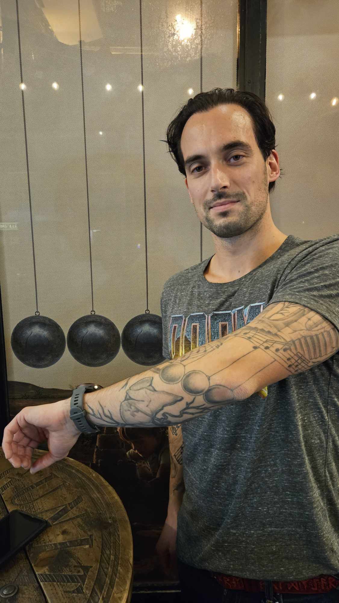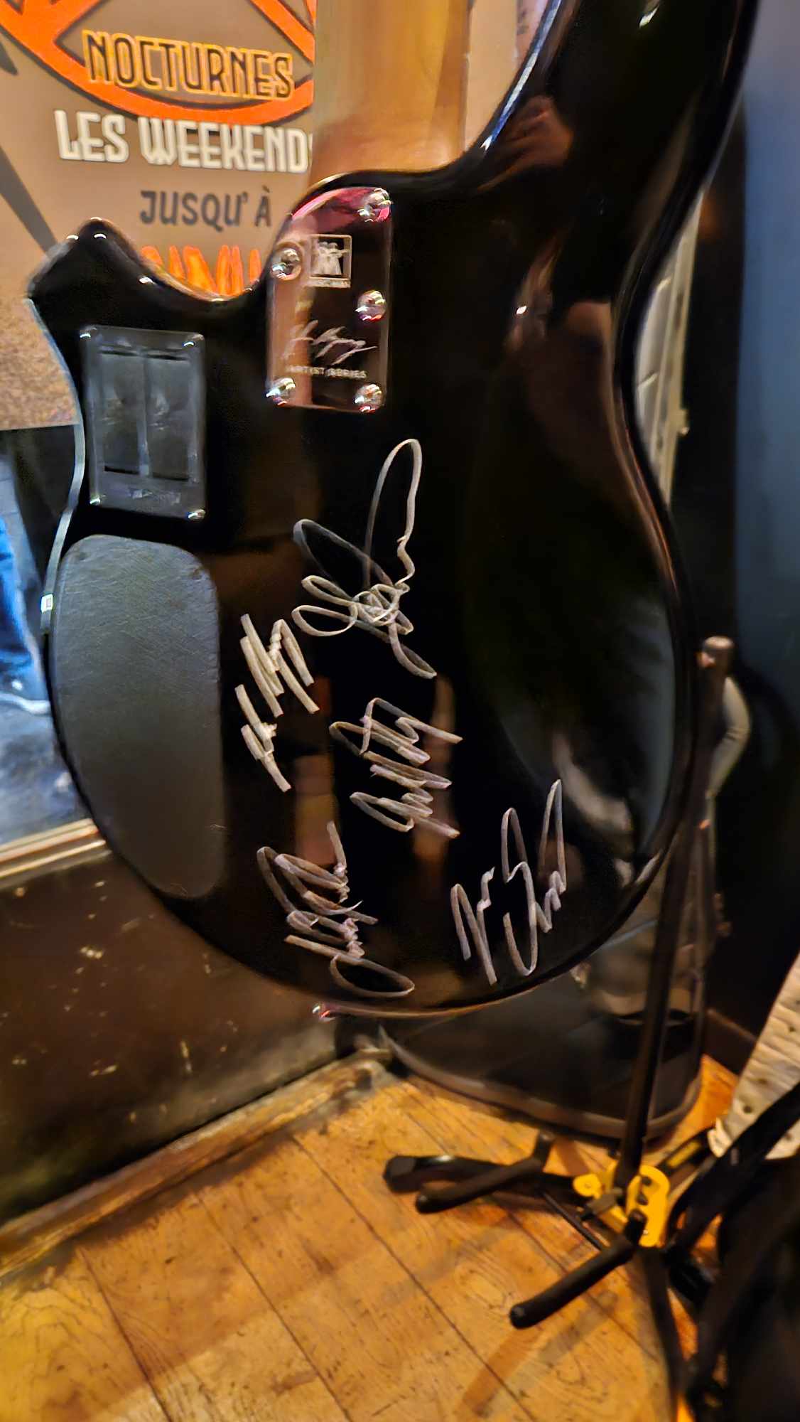 Nous nous mettons en route en milieu d’après-midi, Véro et moi (Kikithehead) pour récupérer notre ami Romain qui a gentiment accepté d’apporter sa basse signature John Myung dédicacée par tout Dream Theater.